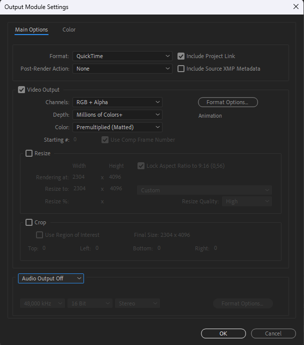 QuickTime, RGB + ALPHA, (RGB ne gère pas transparence, ALPHA ne gère QUE la transparence), audio output off