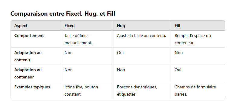 Dans Figma, Fixed, Fill, et Hug sont des options liées à la gestion des dimensions et au comportement des éléments dans les Auto Layouts. Ces paramètres déterminent comment un élément gère sa taille par rapport à son contenu ou son conteneur. Voici une explication détaillée :