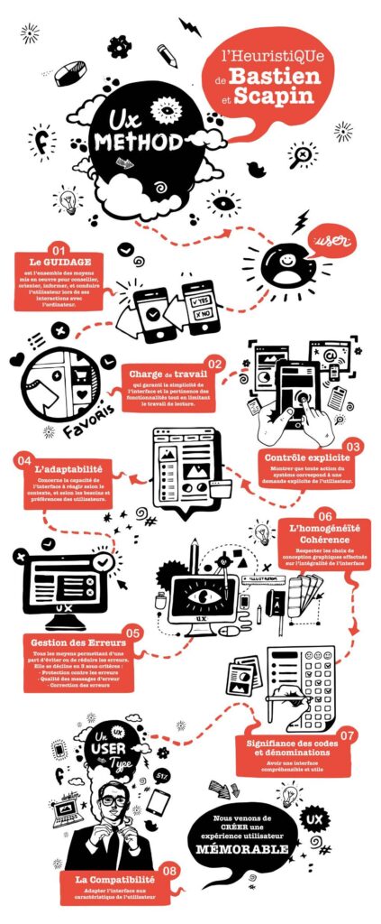 1. Heuristiques de Nielsen : Ces dix principes d’ergonomie développés par Jakob Nielsen en 1994 sont largement utilisés dans le domaine de l’UX. Ils incluent des principes comme la visibilité de l’état du système, la correspondance entre le système et le monde réel, la prévention des erreurs, la flexibilité et l’efficacité d’utilisation, etc.