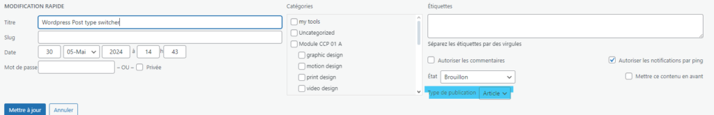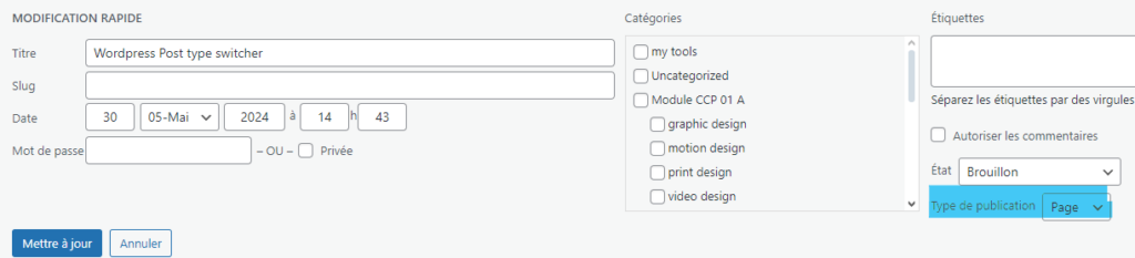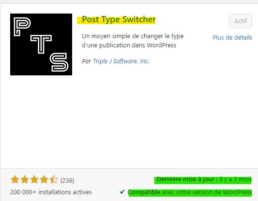 plug in wordpress WordPress Post type switcher vincentmai 30, 2024juin 11, 2024 Post type switcher permet de changer d’article à page